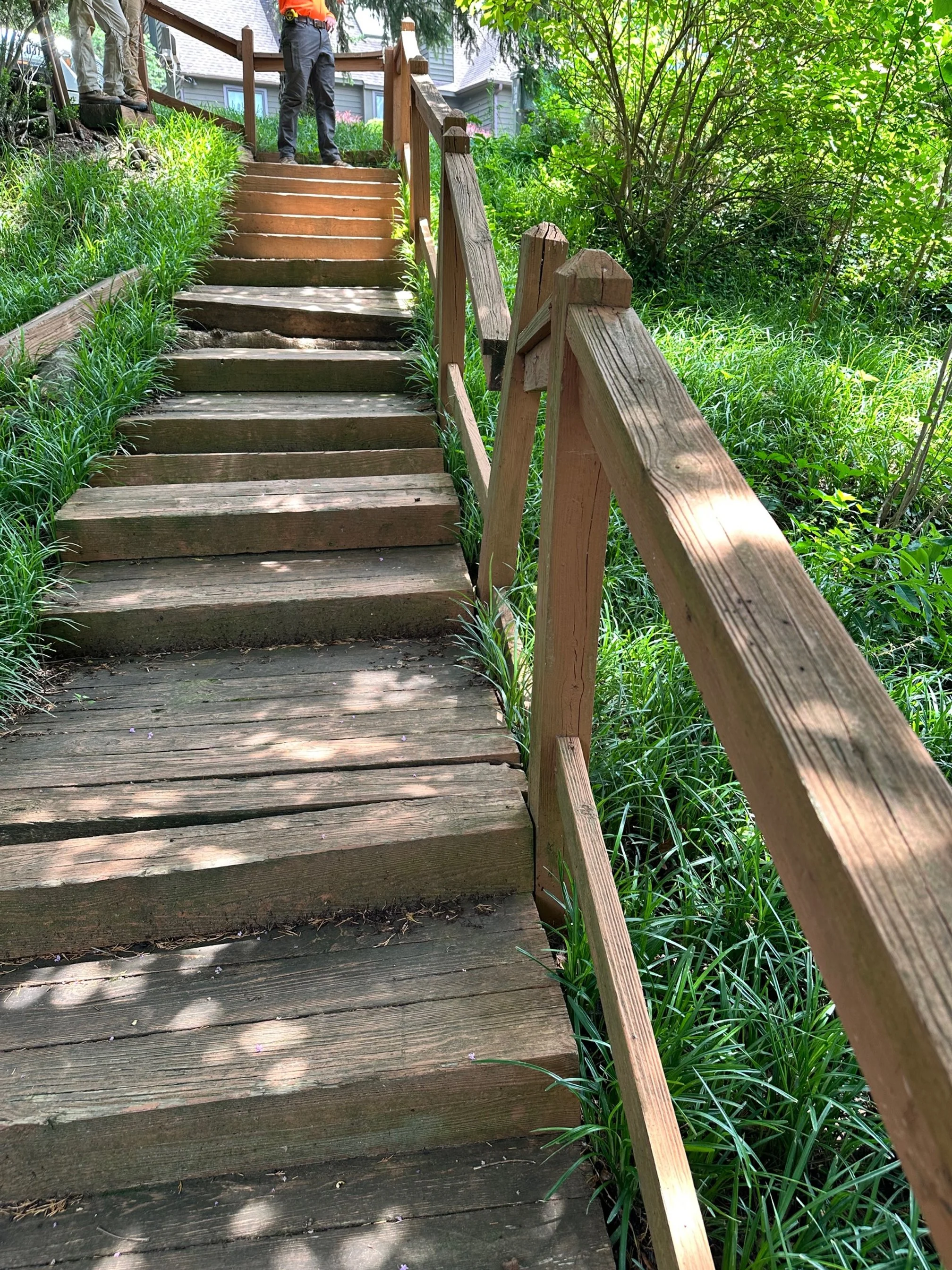 Before - wooden stairs retaining walls made of all 6×6 posts that have taken on too much water and now lean backwards