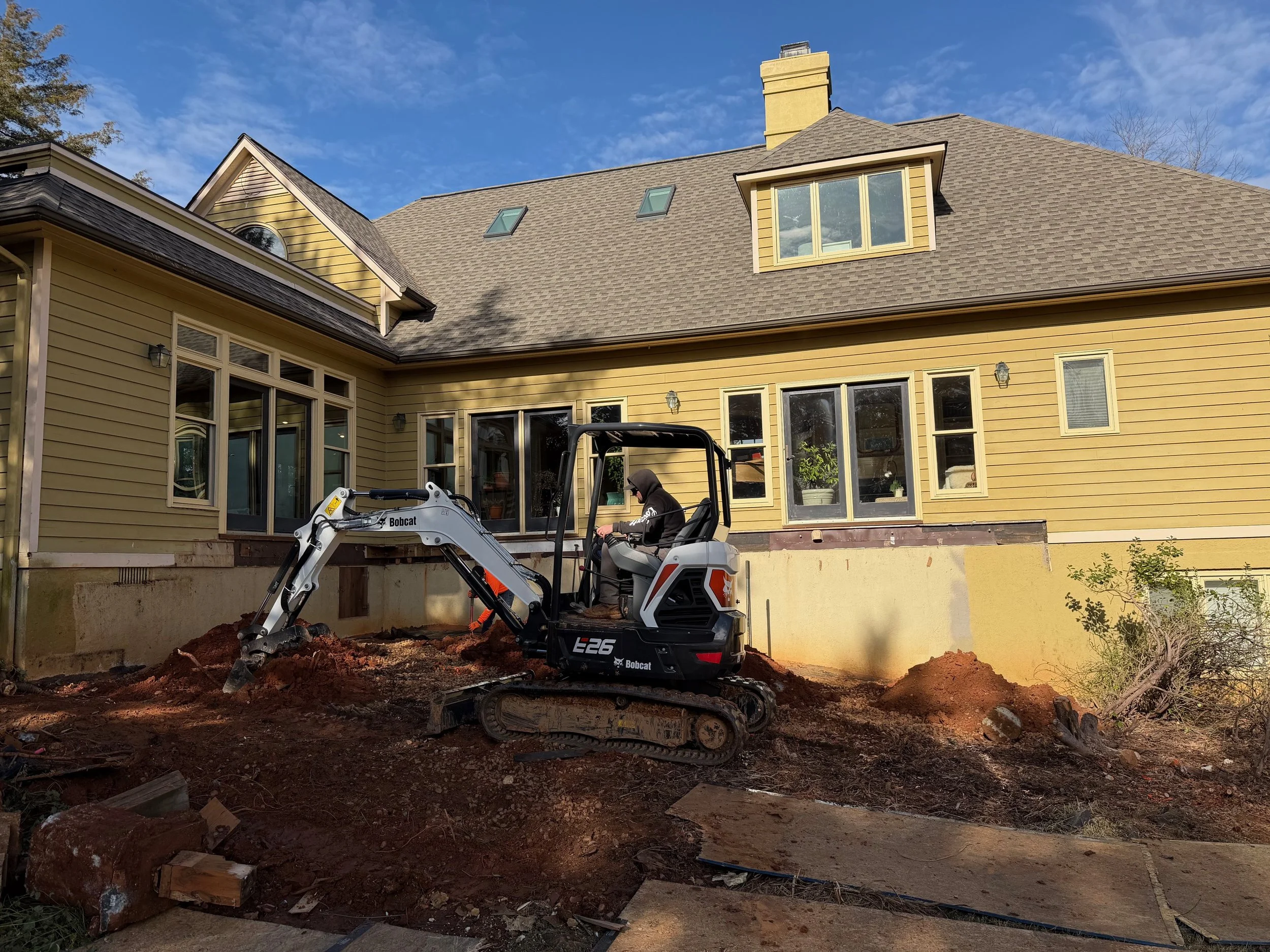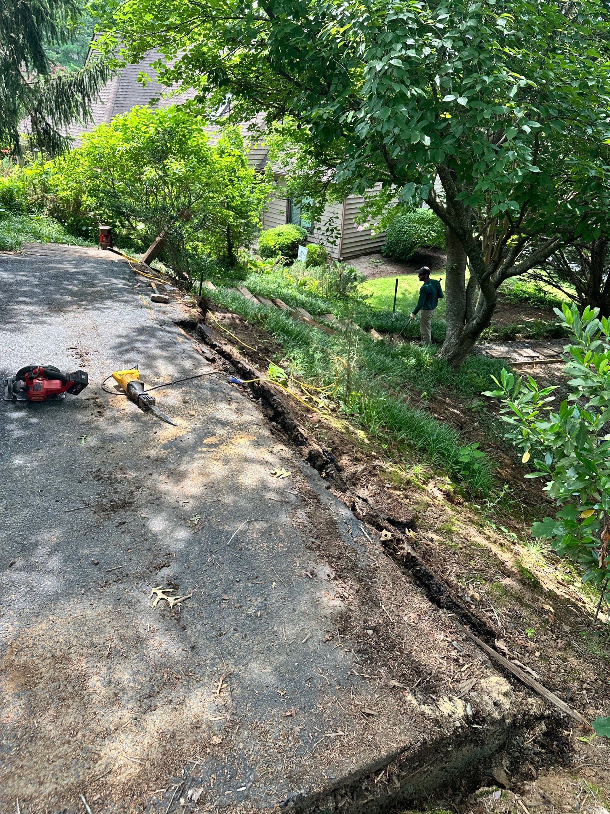 Demo in action - removing the retaining wall and putting a clean cut on the driveway asphalt