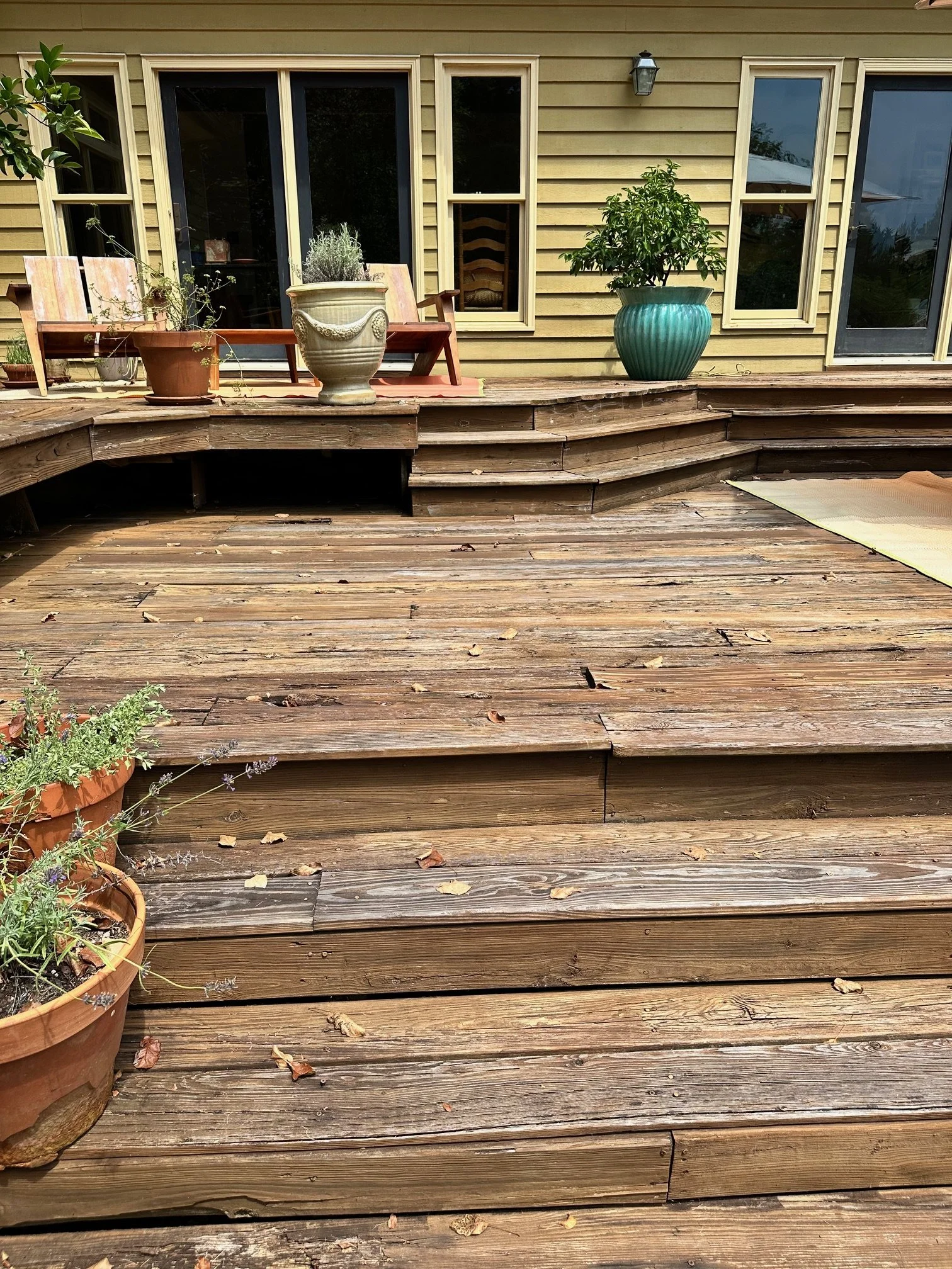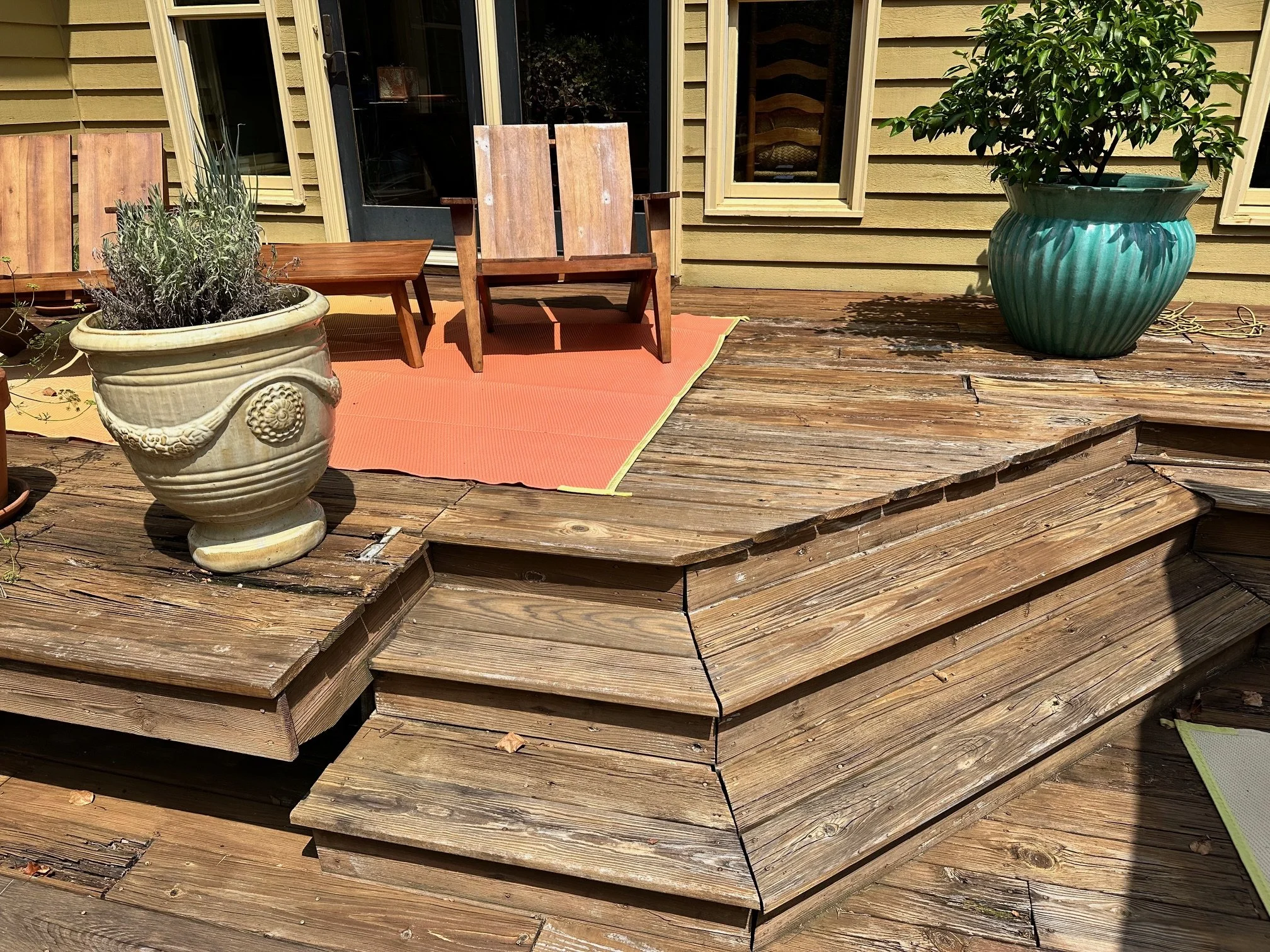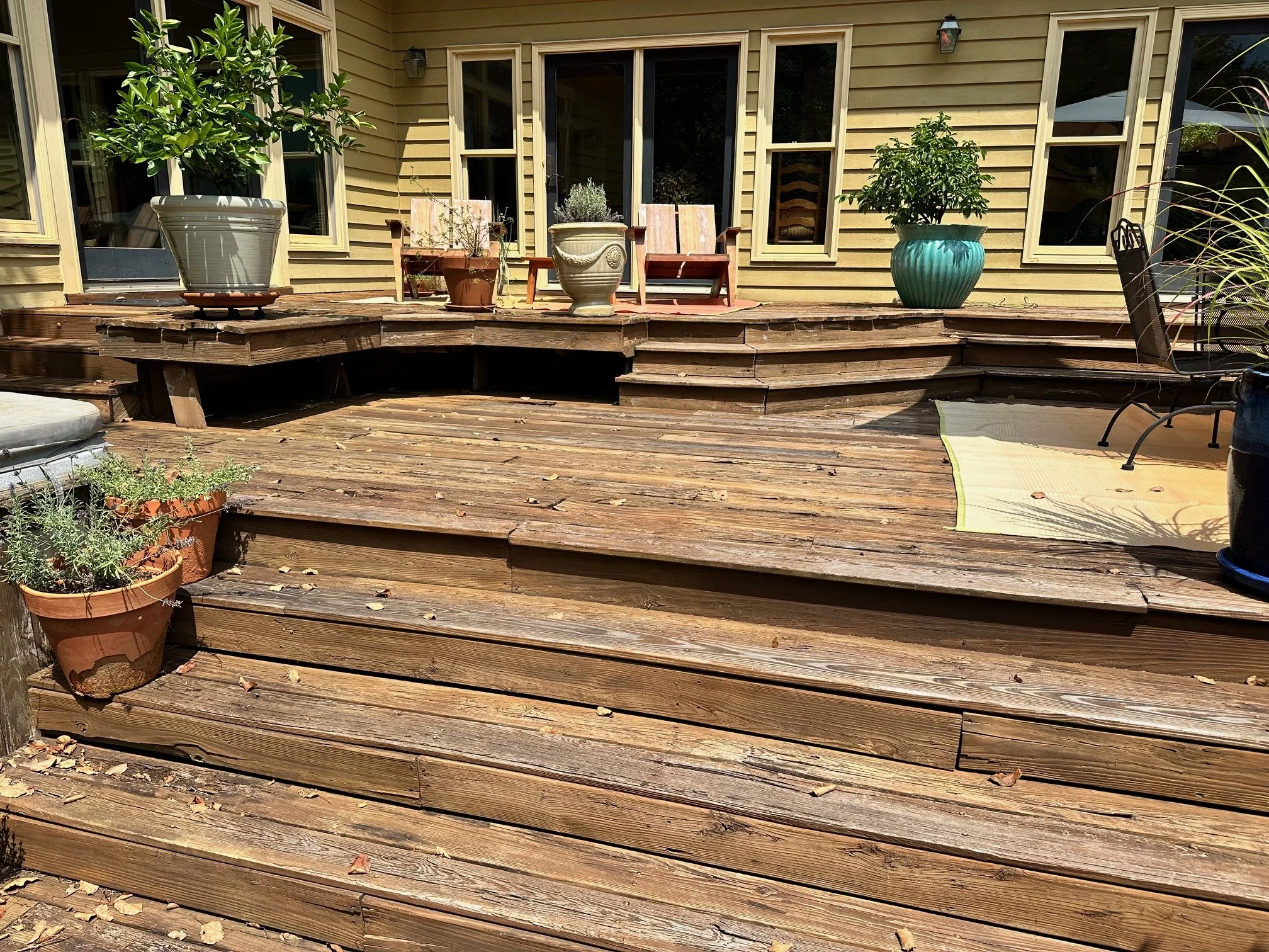 Before - wooden stairs and railings made of all 6×6 posts that have rotted and warped