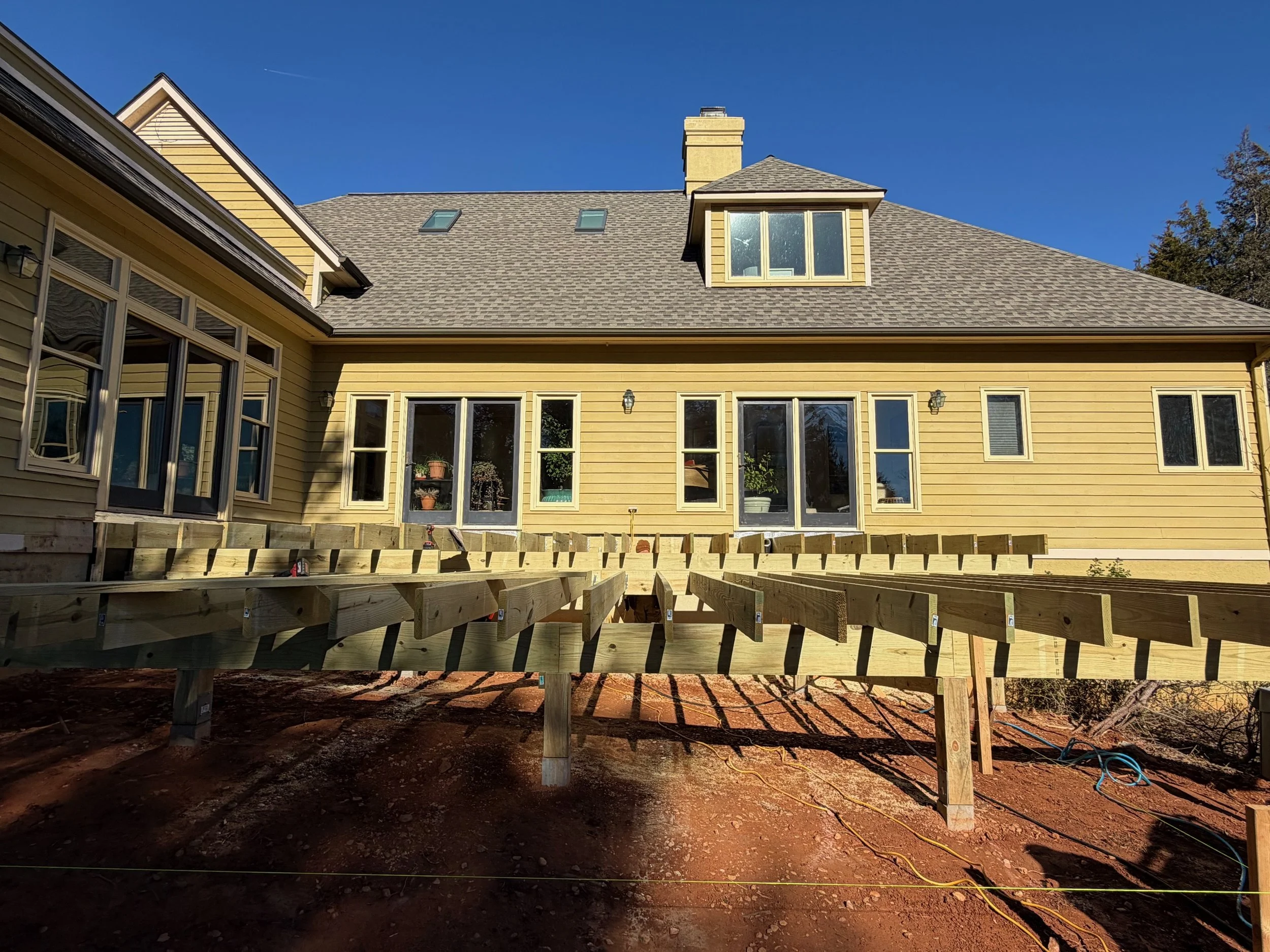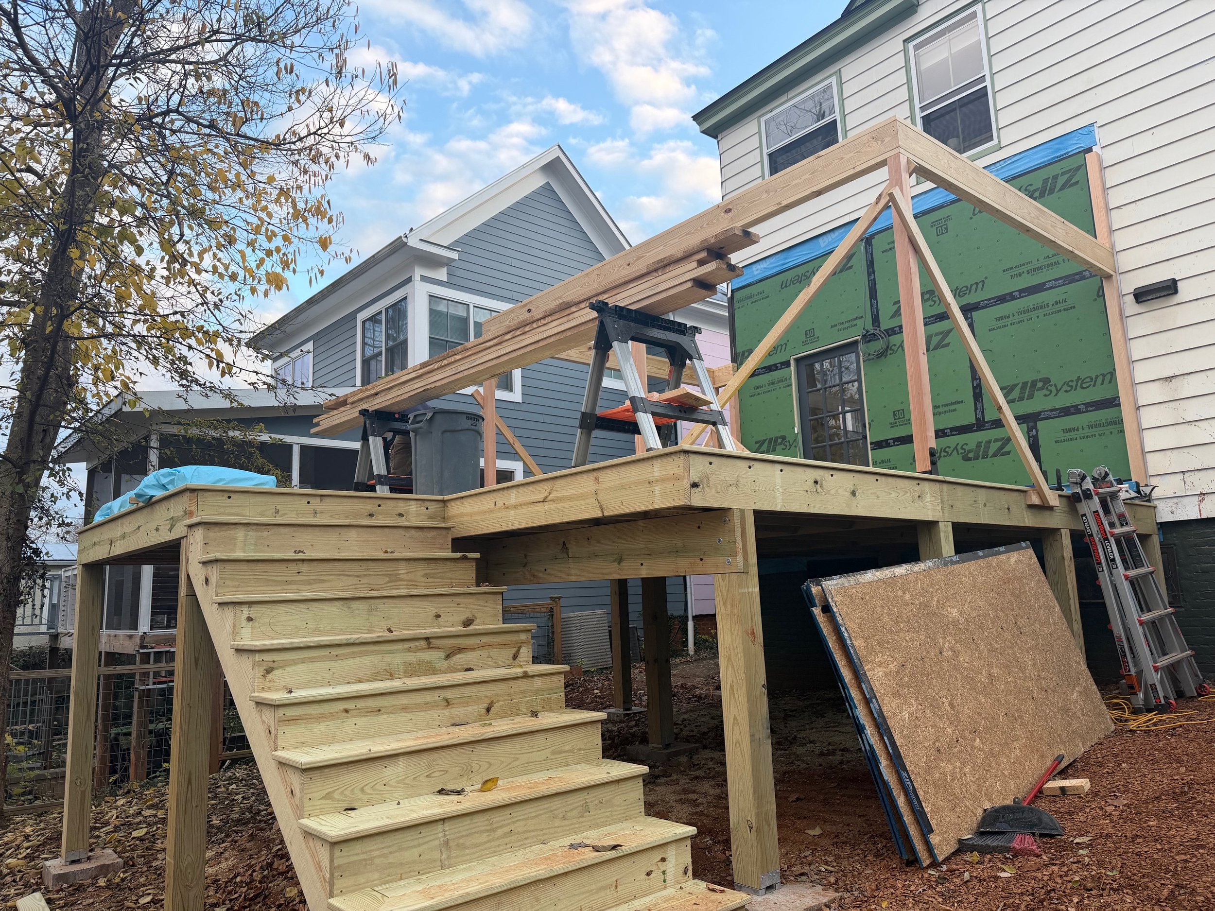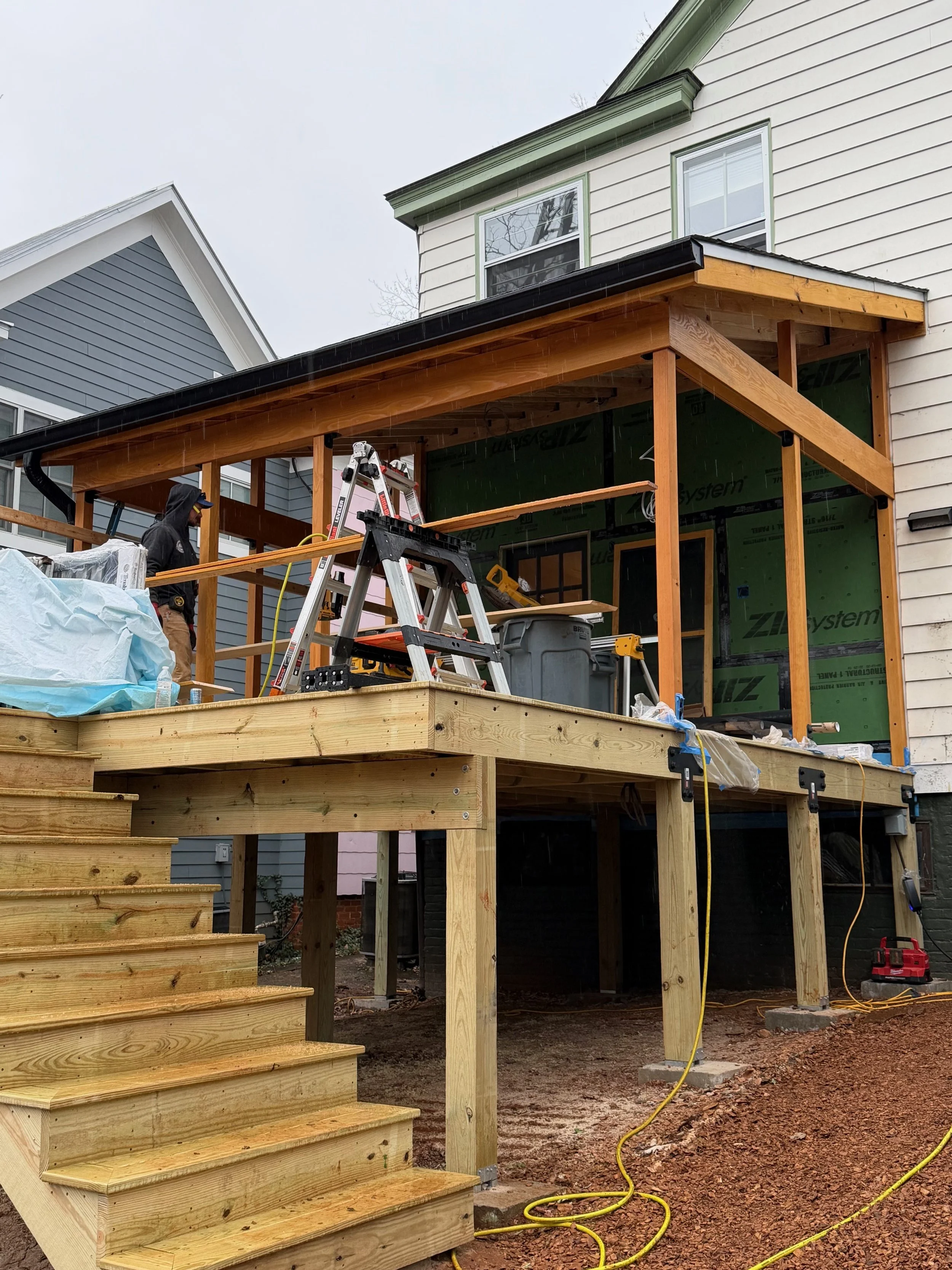 During Construction — Proper bracing of the existing roof structure in place while we tore out the failed porch and deck structure