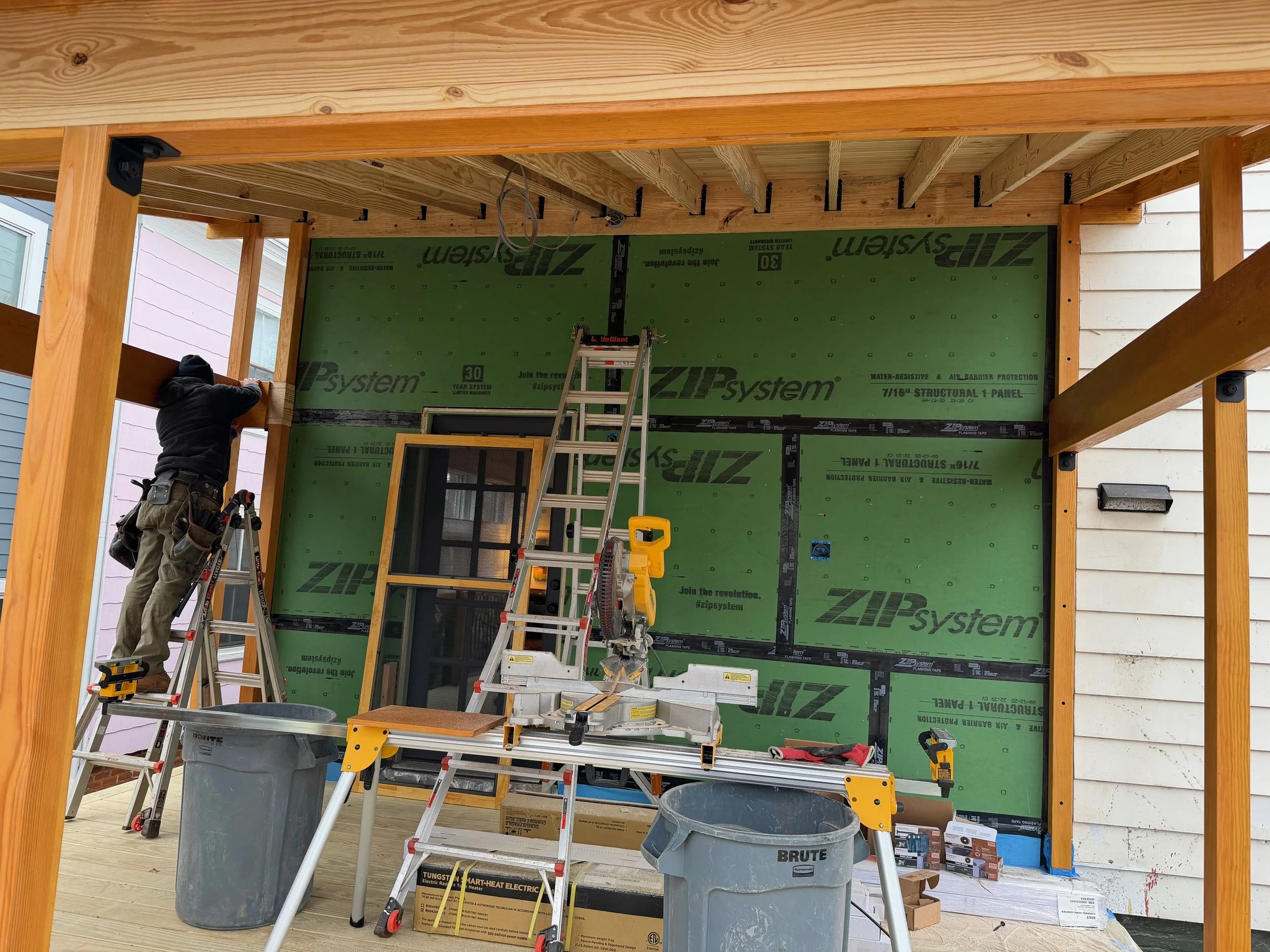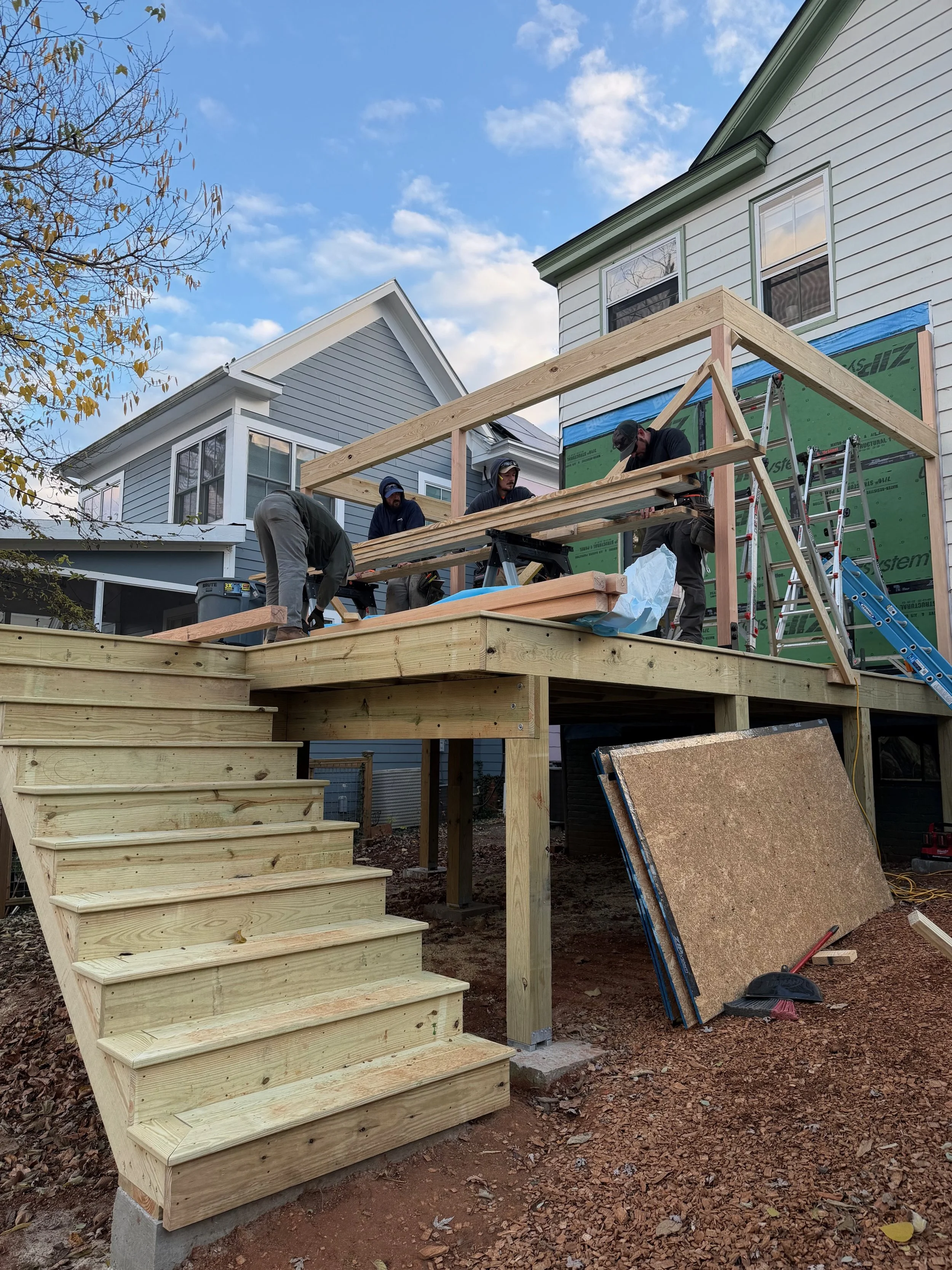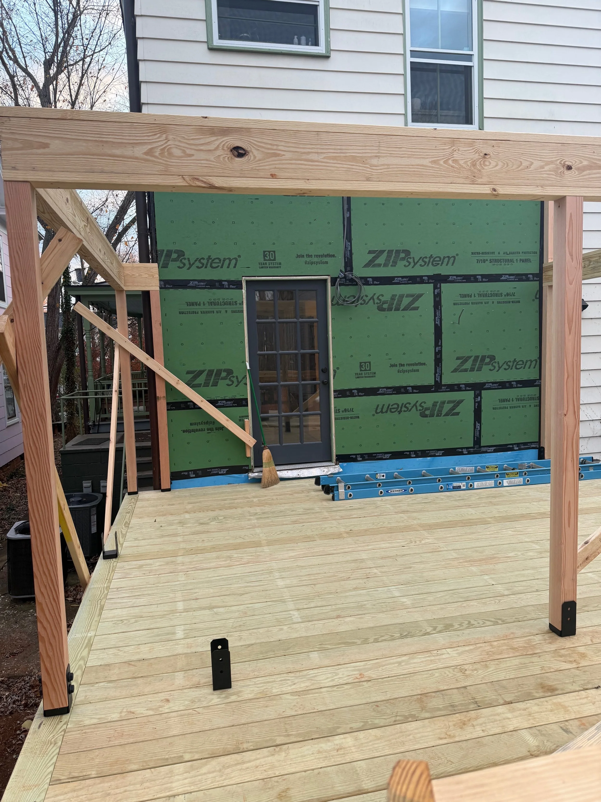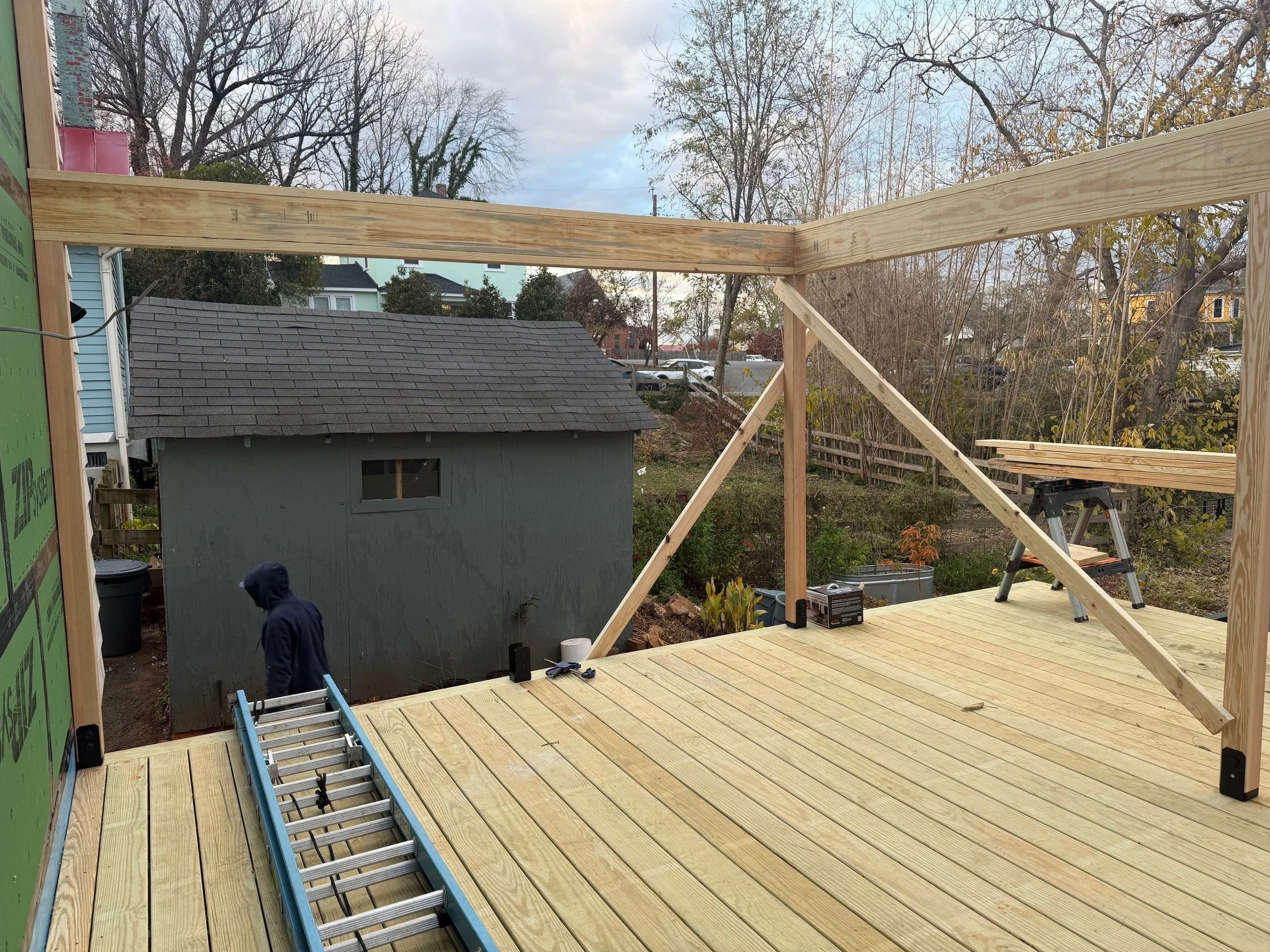 During Construction — Proper bracing of the existing roof structure in place while we tore out the failed porch and deck structure