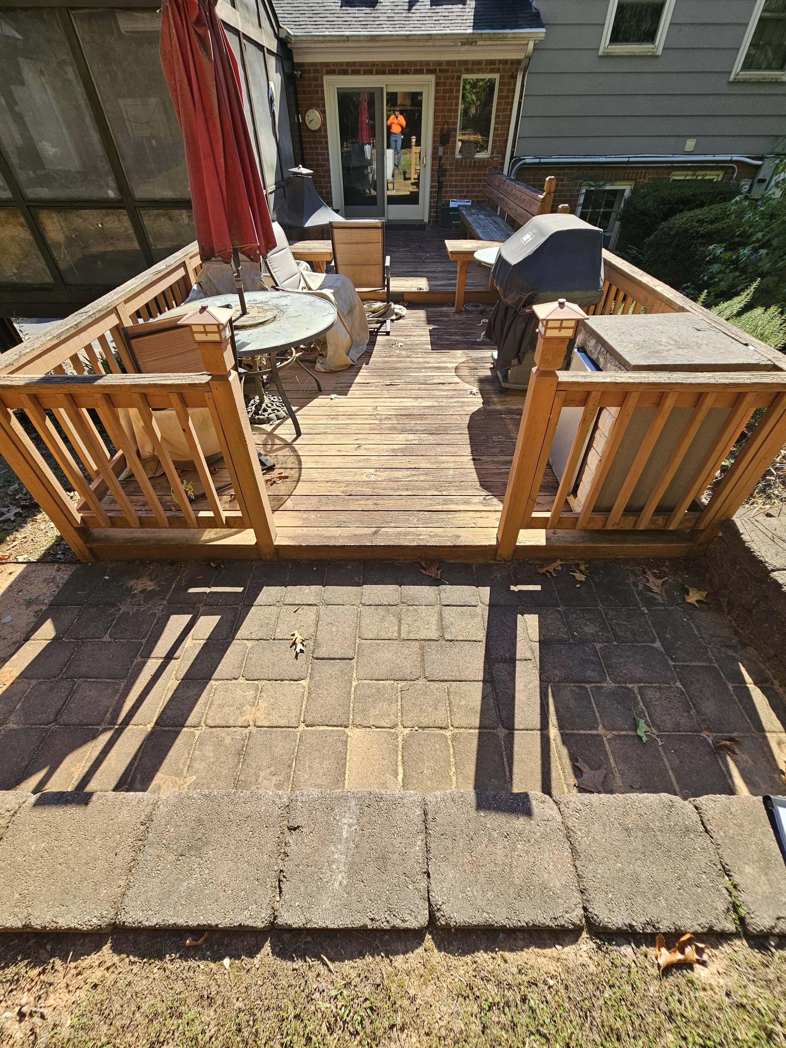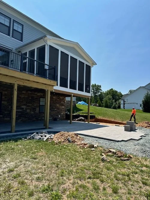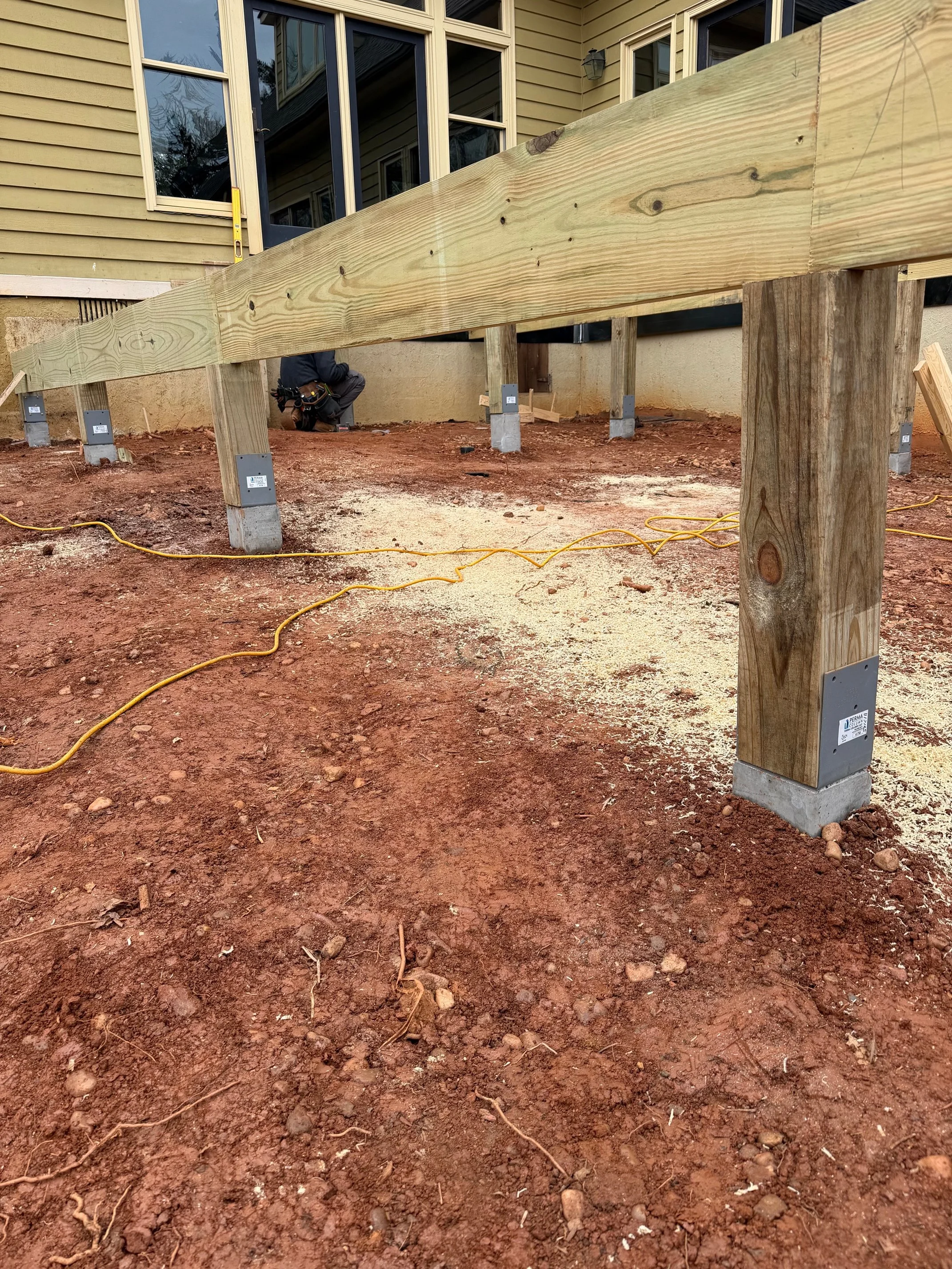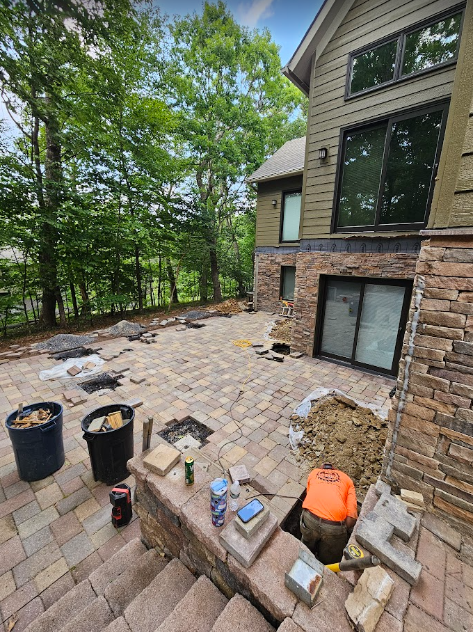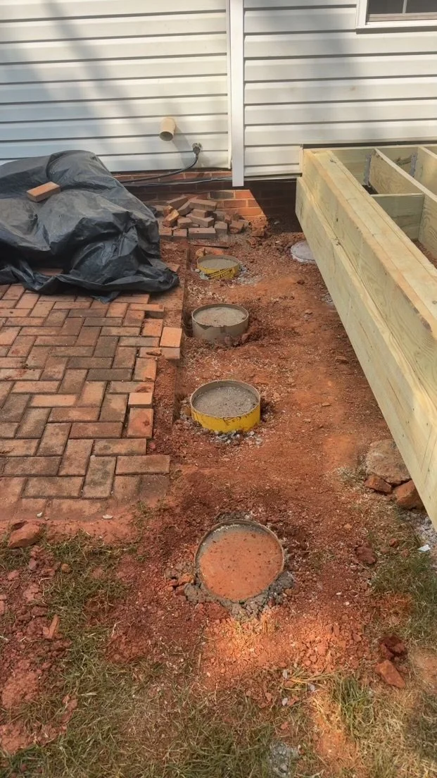 During construction — Strategic demolition to install proper deck footings while being able to put paver patio back in place with minimal disturbance