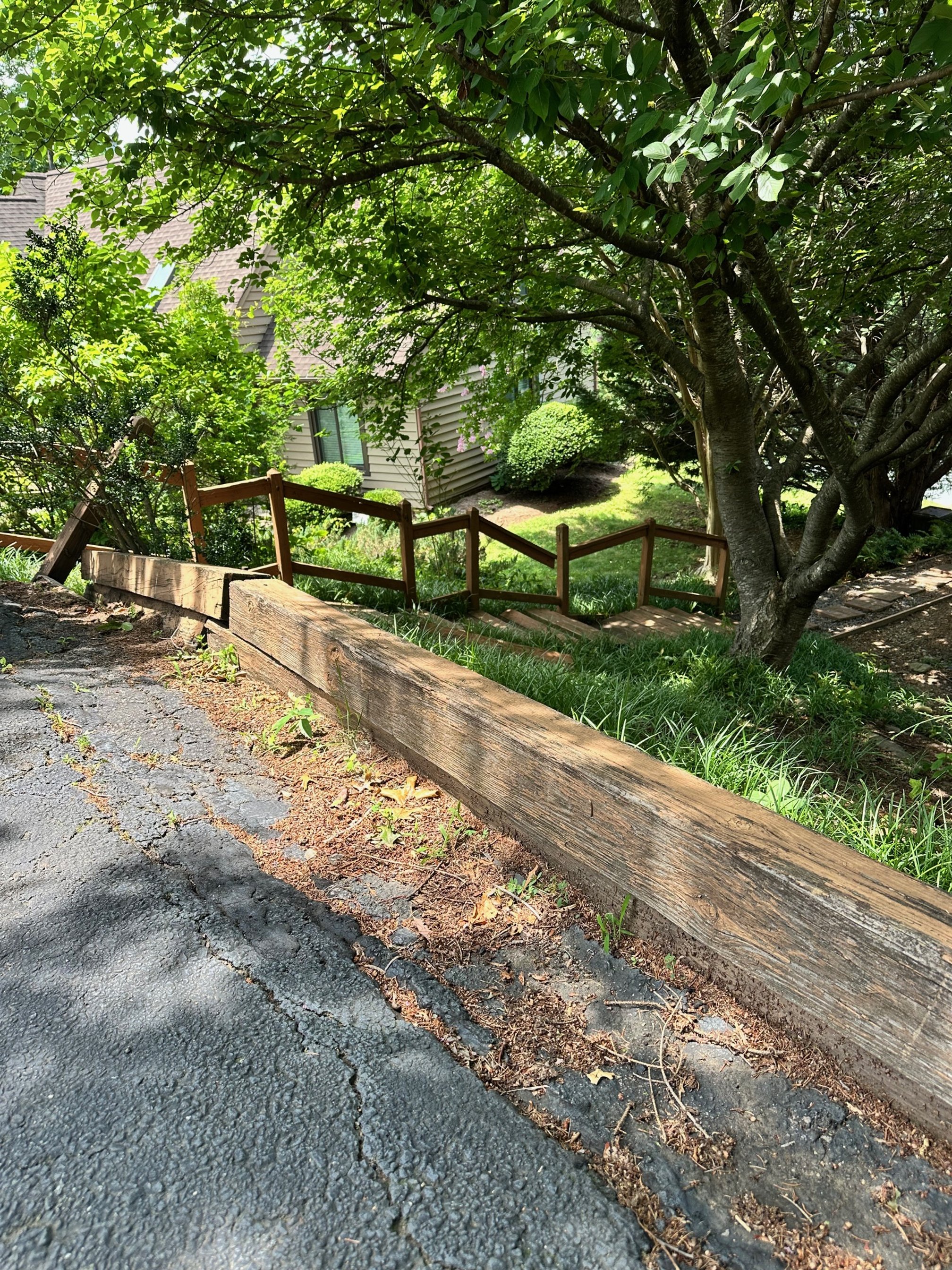 Cut back the failing asphalt, installed a French drain to handle the water run off, and installed fresh timbers that were 12 inches below grade at the lowest point for proper stability